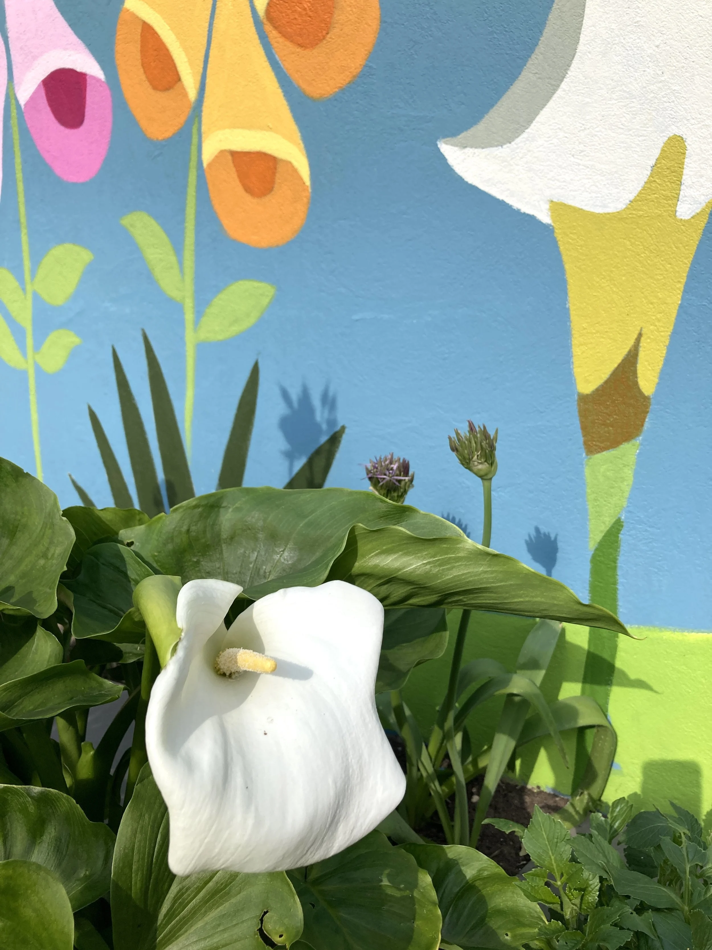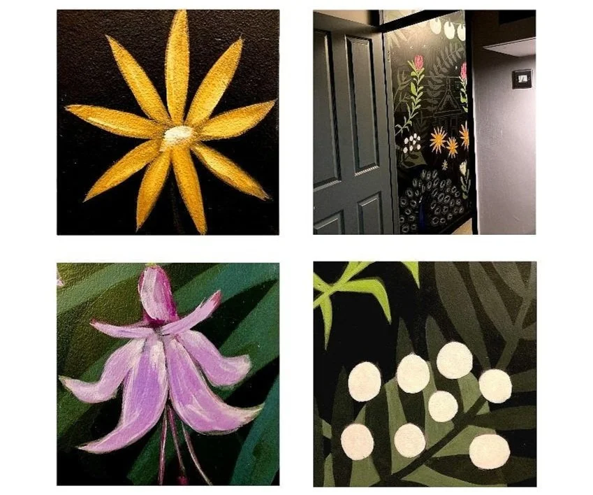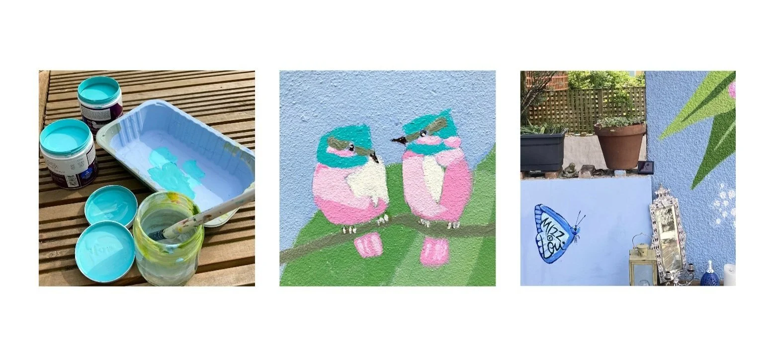 Using a combination of traditional paints and spray paints she has designed and created some colourful and vibrant murals which are bold and graphic in style.